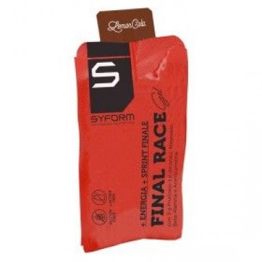 Final Race gel è un innovativo gel energetico indicato per atleti e sportivi che affrontano periodi di allenamento particolarmente intensi; riduce la fatica, contrasta la formazione di lattato, agisce laddove ormai le energie sono alla fine. E’ ideale per affrontare lo sprint finale, in quanto eroga rapidamente energia esplosiva. Contiene: • Fruttosio 1-6 difosfato, meglio conosciuto in gergo come “esafosfina”, storicamente impiegato per il recupero di energia dopo lo sforzo. Questo è un composto ricco di fosforo altamente energetico rapidamente utilizzabile. L’apporto di fosforo ha un duplice effetto: a) tampona l’abbassamento del pH nell’esercizio lattacido b) aumenta la disponibilità di composti altamente energetici (2-3 glicerol ditrifosfato - DPG), e facilita l’utilizzazione di ossigeno dai distretti muscolari più periferici • Acetilcarnitina: è il derivato acetilato della carnitina. Veicola gli acidi grassi che intervengono nella produzione di energia e migliora l’attività nervosa durante lo sforzo. • beta-Alanina: è un precursore della carnosina, cui sono riconosciuti un significativo effetto tampone sull’acido lattico muscolare ed una preziosa azione antiossidante. Grazie a tali proprietà, contrasta l’affaticamento muscolare. • Magnesio: è un minerale essenziale per regolare la contrazione muscolare e la trasmissione dell’impulso nervoso. La concentrazione di zuccheri è inferiore agli altri gel Syform, proprio per renderlo più velocemente assorbibile e leggero a livello gastrointestinale.